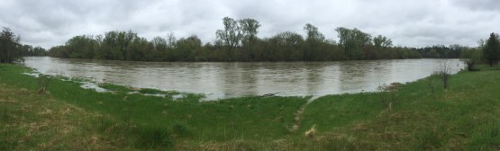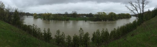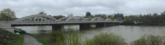 From there, I rode down to the bridge at Bridgeport. There’s a flow gage here, so you can get real-time flow data online (more numbers coming…). On May 1st, the flow rate here was about 30 cubic metres per second. In other words, 30,000 litres of water flowed under this bridge every second on May 1. Normal summer low-flow is about 11 cubic metres per second (11,000 litres per second).