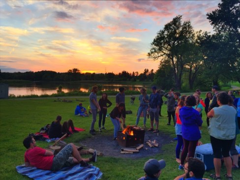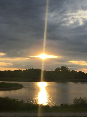 My cycling weekend started on Friday night, with a ride to the Berlin Bicycle Cafe in Belmont Village in Kitchener. They were hosting their first “Full Moon Ride”, where cyclists were invited to join them on a ride from the cafe to Columbia Lake at the University of Waterloo for a camp fire and snacks. I rode the short 7 km from home to the cafe where I ran into a lot of my cycling friends: Raf, Shelly, Sandra, Scott, Jen, Mike, among 30-40 others. The big group made its way to UW where a campfire was started. The sunset over the lake was wonderful, but the rest of the sky was cloudy, so we couldn’t see the full moon rise.