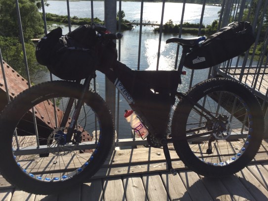 The bag attaches to the bike by way of a metal rack. The rack attaches securely to the seat post rails with a quick-release mechanism and to the seat post with a clamp and velcro strap. The bag slides onto the rack and a velcro strap tightens the bag around the seat post. The rack provides stability and minimizes sway. On my bikepacking trip, we rode on some winding singletrack and there was no noticeable sway in the bag, even fully loaded. Here’s a video that shows how easy it is to attach the rack and bag to a bike.