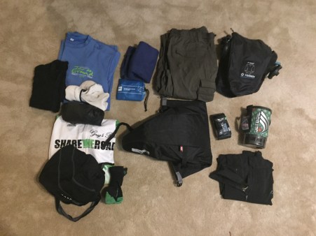 - Cycling kit for second day (short-sleeve jersey, bib shorts, socks)