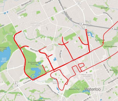 The route was about 40 km start-to-finish, and it involved some U-turns, but it was fun to plan and ride it… and it only rained a bit!