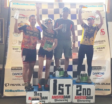 Eventually they gave out awards for the 50 km race, and I got on the top step of the podium for the 50 km fat bike category (there were four of us in this cat). There were no medals awarded, but… I got a big, glass beer mug AND a six-pack of Amsterdam beer, which is, in my opinion, better than any medal (unless you’re talking a solid gold medal!). This was my very first individual first-place podium placing (unless you count swim races way back in high school!). It felt good, and the beer tastes great!