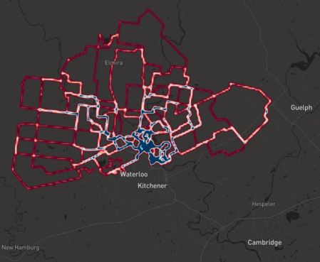 AthleteDataViz: This website is another heatmap site that can show different types of data on your heatmap, such as frequency, speed, elevation. I haven’t quite figured out how to show all the different features yet. Here’s a screen shot of my 2018 local heatmap. Bluer colours are routes I’ve cycled more frequently.