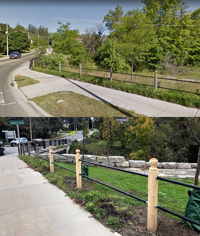 The second set of photos look from the roundabout northwards, up Bridge Street. The “Before” photo (from Google Maps) shows a fence with wooden posts, then some grass, and bushes. Just beyond those bushes lies Laurel Creek, close to 10 feet below the road elevation. The “After” photo shows that three of those wooden fence posts have been replaced because of the incident, as well as the large landscaping stones that have been added to prevent another driver from plunging their vehicle to the creek below.