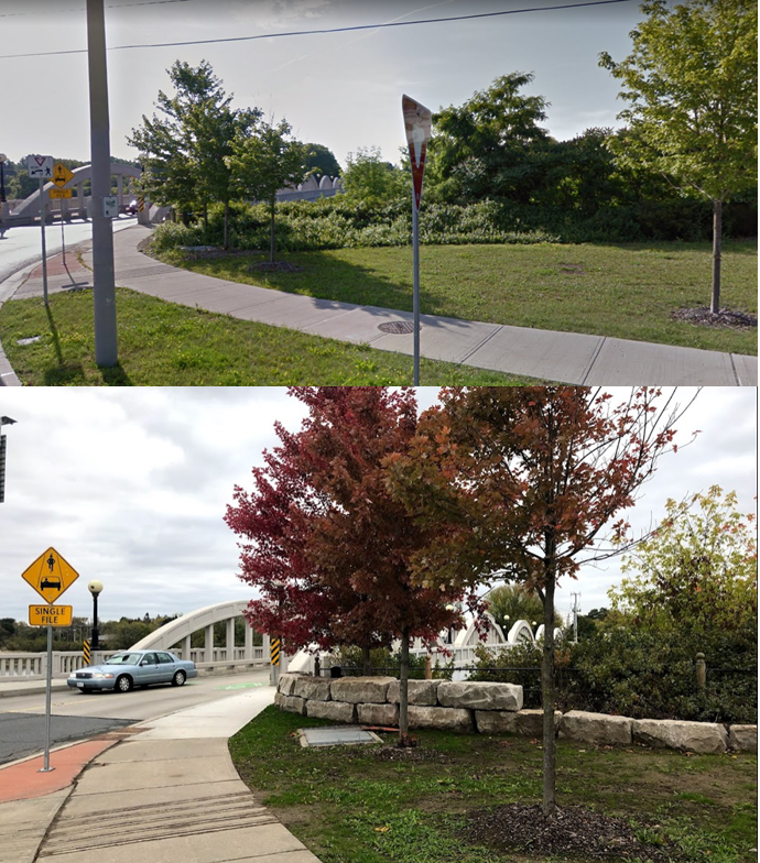For these modifications, they brought in large landscaping stones. First, in these two photos, let’s look south toward the bridge across the Grand River. The photos show “Before” and “After” photos (the “Before” shots are from Google Maps). In front of the concrete bridge, you can see a few small trees and some low bushes. I believe the car went into the river next to the small trees. The “After” photo shows the large landscaping stones that were installed to prevent a driver from falling into the river if they lose control in the roundabout.