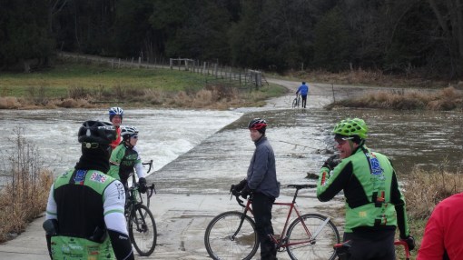 The Conestoga River passes through Hawkesville and there’s one main bridge that crosses the river.  There are also a couple of smaller crossings that vehicle traffic avoids. The planned route was to take Temperance Rd and avoid the main bridge, instead following one of the “smaller” bridges. As group leader that day, I approached the bridge cautiously.  Clearly, this low-lying concrete structure was under the swift-moving water of the Conestoga River.  But as I got closer, I realized that it wasn’t too deep and I’d be able to ride across.
