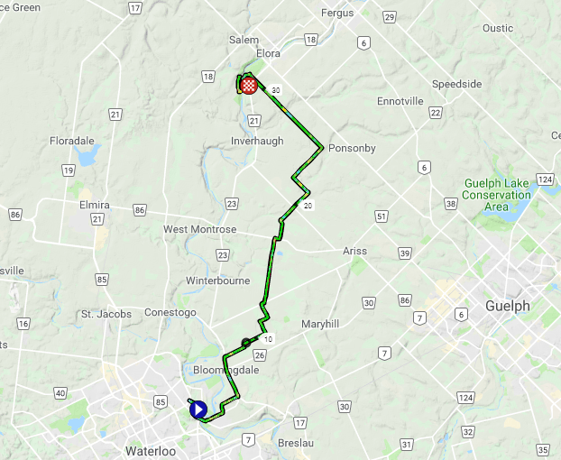 Since the ride was only about 30 km (and because we weren’t organized enough to leave any earlier), we left K-W around 7 pm on Friday night.  There are many routes to get to Elora from K-W, depending on whether you want to take paved or dirt roads.  We plotted a route that took as many dirt and gravel roads as possible.