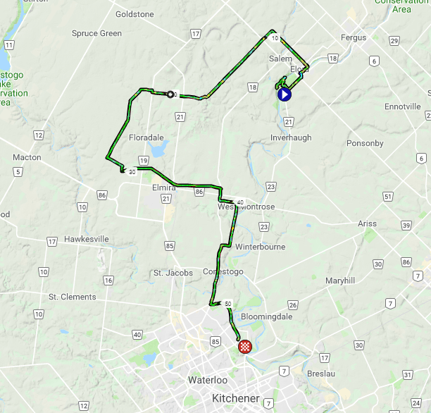 For the route home, we wanted take a different route back to K-W and we wanted to include gravel roads.  We ended up with this route: