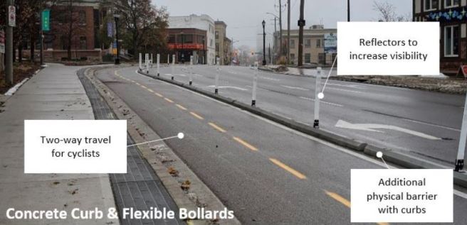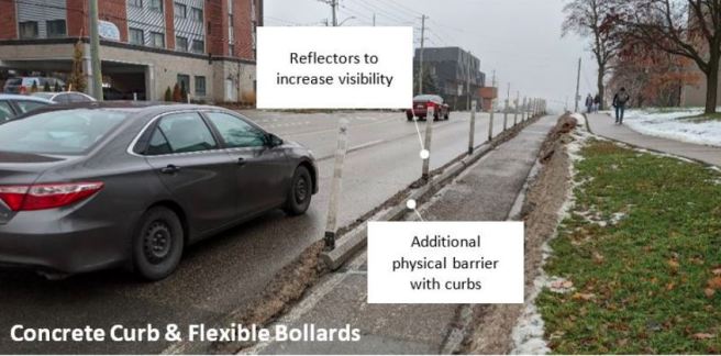 This section of University Ave. can get very busy with buses, commuters, pedestrians, students because it’s the main road between the two universities. Having protected bike lanes along here makes sense. An unprotected bike lane existed on this stretch of University prior to the physical separation that was installed last fall (2019). The Region website describes these installations as “concrete curb and flexible bollards” (see photo below from the Region webpage).
