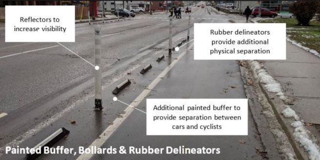 This new protected bike lane has been designed with painted buffers, bollards and rubber delineators (see below). I don’t frequently ride on King Street in this area. The south end of this protected bike lane is at the busiest intersection in the area: King and University. I’m not sure the rubber delineators do much, and I hope the bike lanes remained plowed in winter.