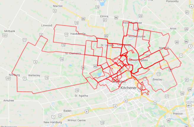 Some of my cycling has been in the city. Last year, (2019), I blogged about the Bike Lane Pilot in the City of Waterloo. As discussed at the time, the City has installed several types of bike lanes around the University of Waterloo and Laurier. These days, the bike lanes have been through their first winter, and I can report that the worst design option involves the painted buffer and bollards (On Columbia Street West, between UW and King Street. Many of the bollards are bent, and some have even been removed (hopefully to be replaced?). The other options (bollards with physical barriers) have fared much better. Clearly, the physical barrier provides more protection, as drivers can see that their car might be damaged if they hit the barrier. The bollards simply bend when they’re hit.